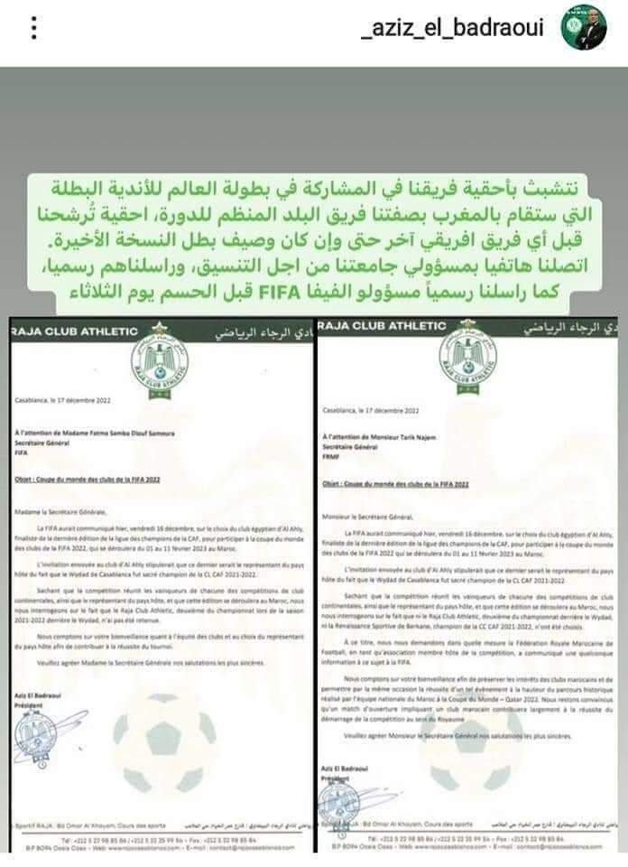 وأرفق رئيس نادي الرجاء المغربي في تدوينته على انستجرام صورة من الخطاب الرسمي المرسل من قبل النادي إلى الاتحاد الدولي لكرة القدم فيفا، للمطالبة بأحقية النادي في المشاركة ببطولة كأس العالم للأندية.