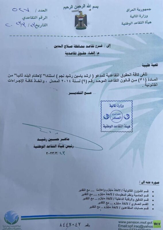 أظهرت وثيقة صادرة عن هيئة التقاعد الوطنية العراقية، توجيها بإلغاء الحقوق التقاعدية للمرافق الأقدم للرئيس العراقي الأسبق صدام حسين.