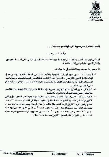 وحصل”هنا مصر” على صورة من الخطاب الصادر، والذي جاء نصه:” ايماءًا إلى الإجراءات الجاري اتخاذها بشأن الأعداد والتجهيز لعقد امتحانات الفصل الدراسي الثاني لطلاب الصفين الأول والثاني الثانوي العام 2023 …يرجي اتخاذ الآتي: