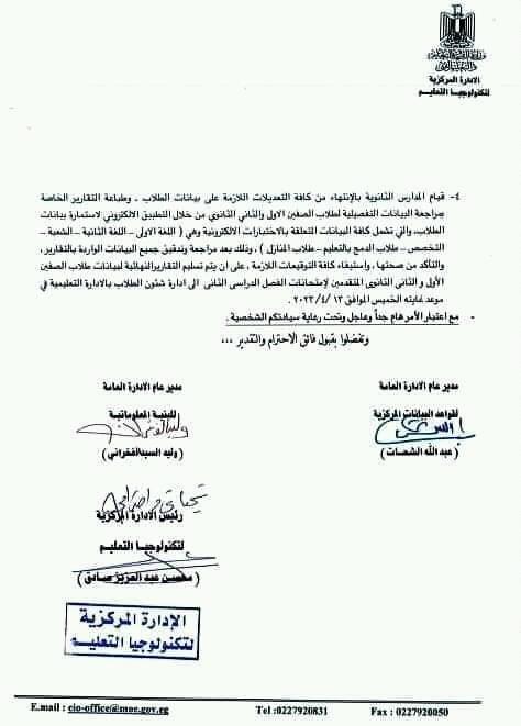 وذلك بعد مراجعة وتدقيق جميع البيانات الوارية بالتقارير والتأكد من صحتها، واستيفاء كافة التوقيعات اللازمة، على أن يتم تسليم التقارير النهائية لبيانات طلاب الصفين الأول والثانى الثانوى المتقدمين لامتحانات الفصل الدراسى الثانى الى ادارة شئون الطلاب بالادارة التعليمية في موعد غايته الخميس الموافق 13 / 4 / 2023