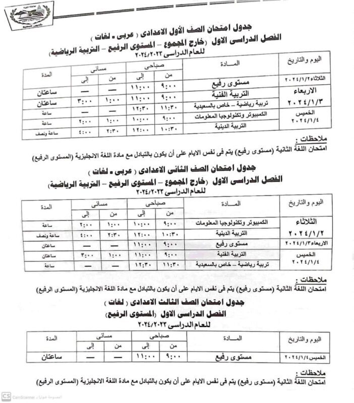 - تبدأ امتحانات الصف الأول الإعدادي في الفترة من 9 إلي 16 يناير 2024