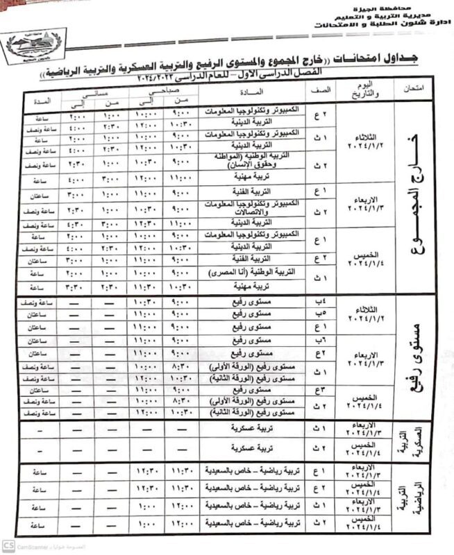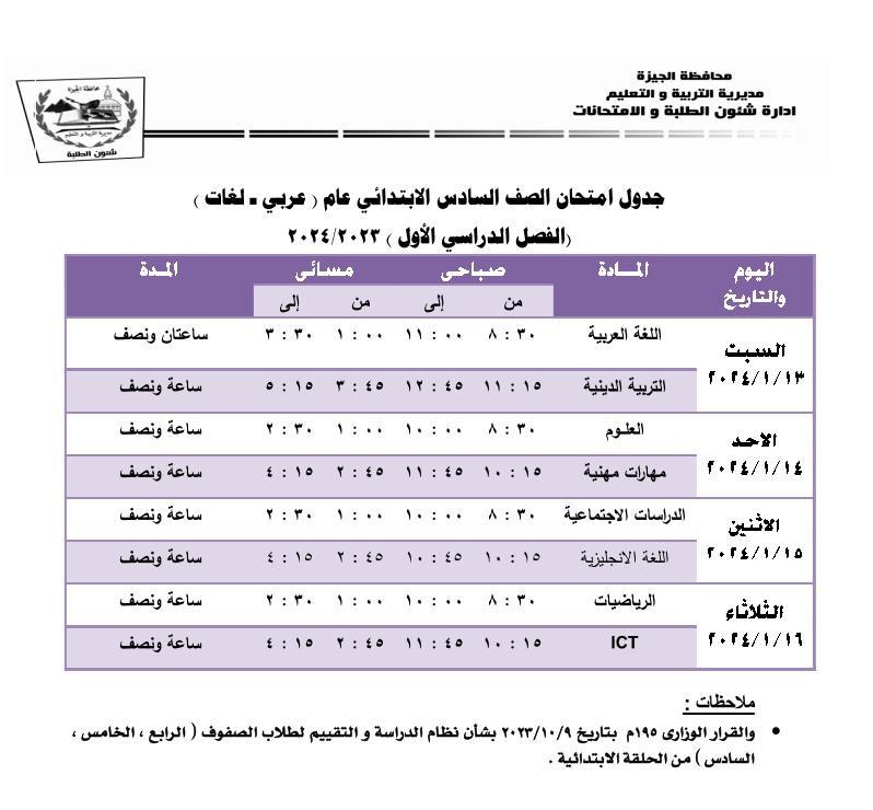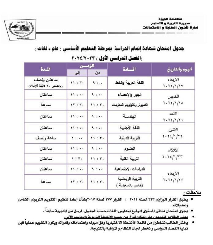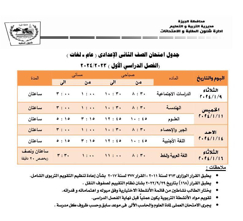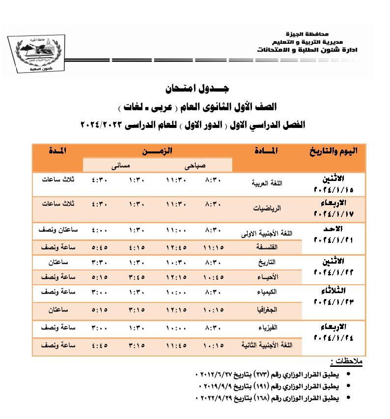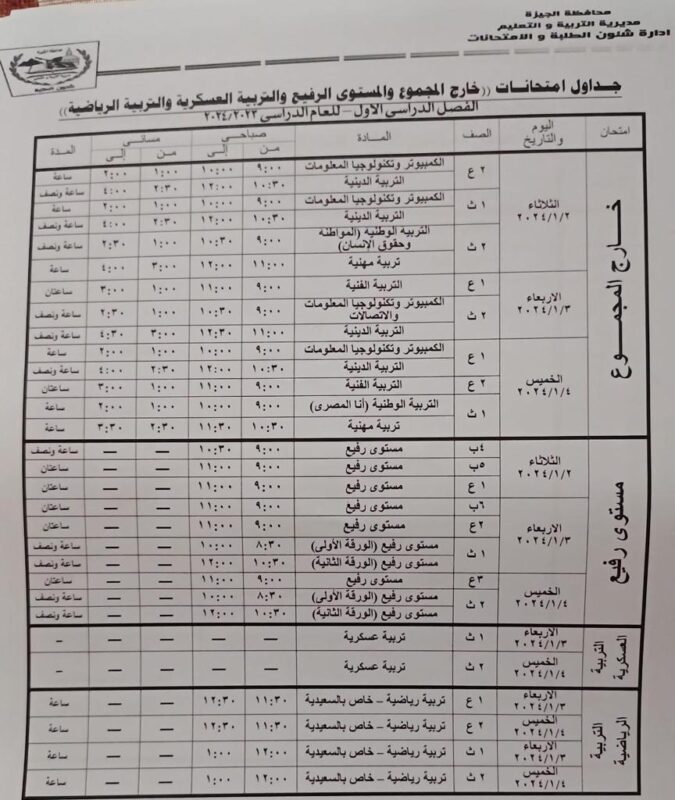 جداول امتحانات الفصل الدراسي الأول 2024 الجيزة