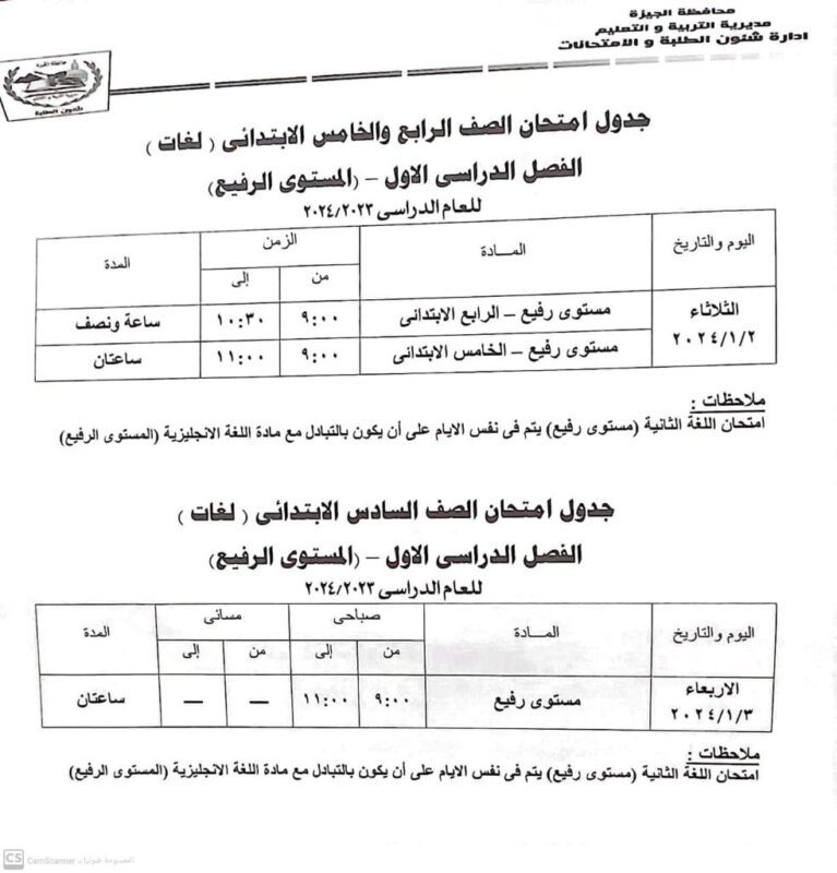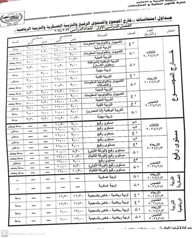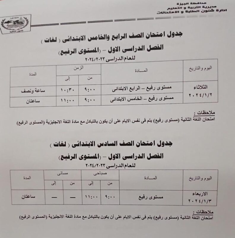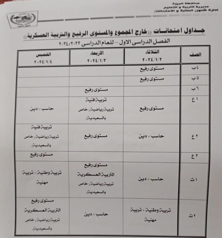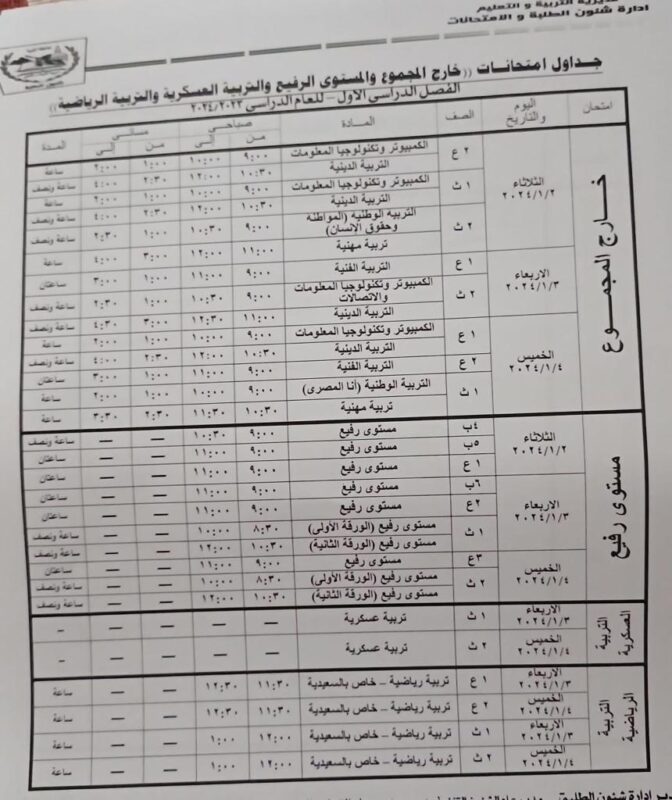 والصف الرابع والخامس الابتدائي (عام وفصل واحد ومكفوفين ) تبدأ من السبت 6 يناير وحتي الخميس 11 يناير 2024 .