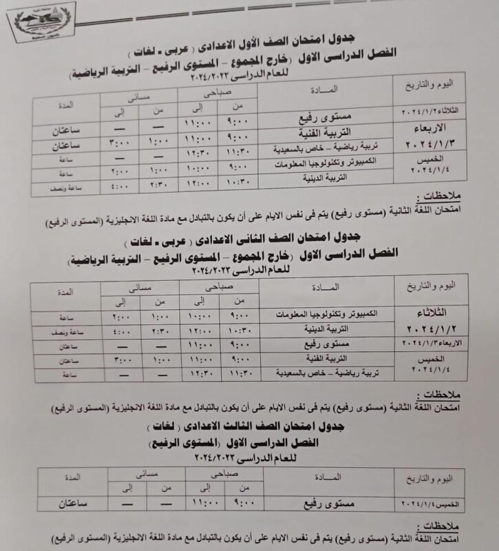- تبدأ امتحانات الصف الأول والثاني الاعدادي من يوم 13 يناير وتستمر حتى 17 يناير 2024م.