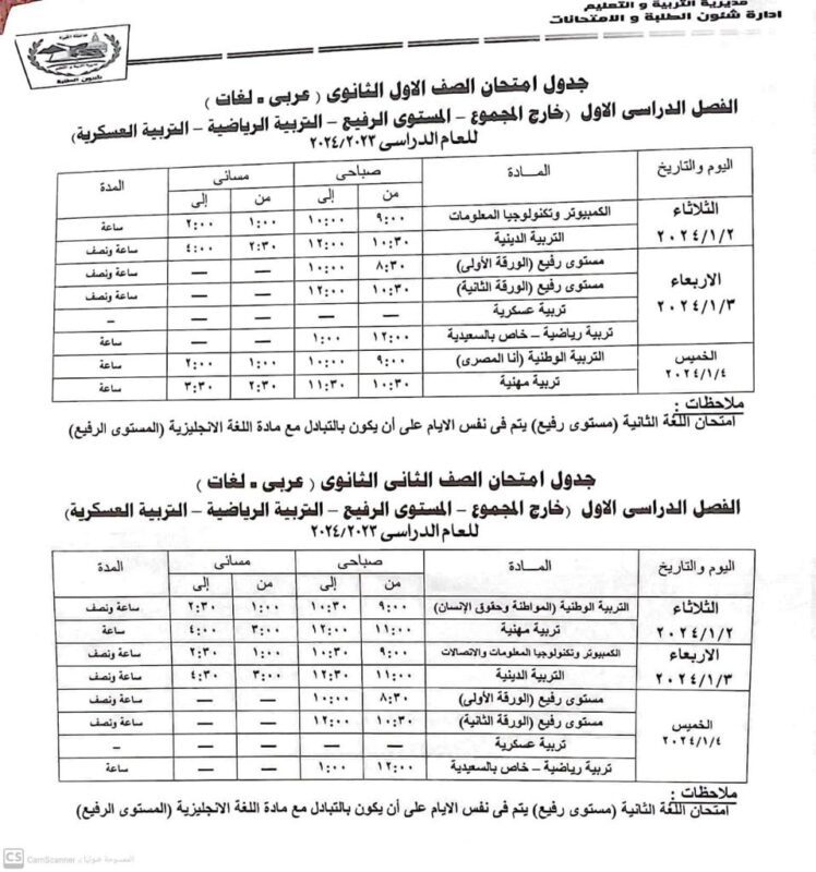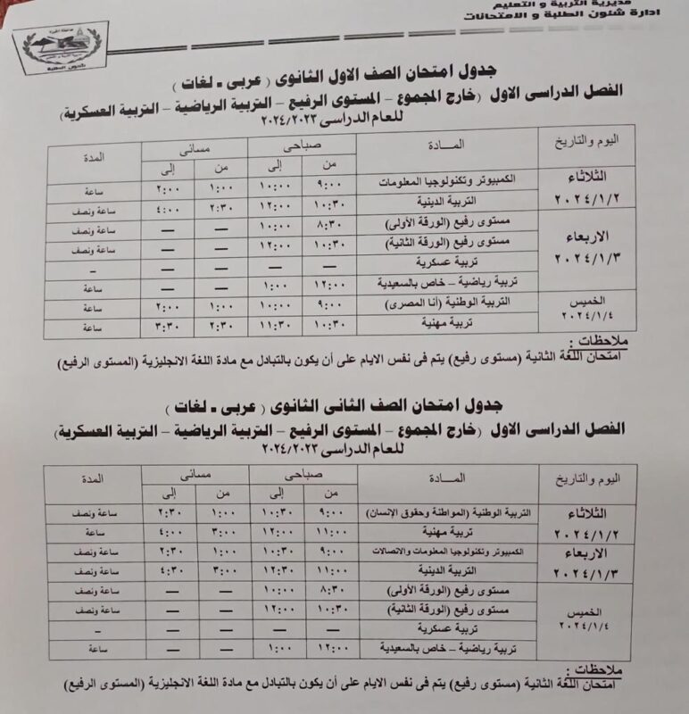 الصف الثاني الثانوي العام يبدأ من الأحد 14 يناير 2024 وحتي الأربعاء 24 يناير 2024 .