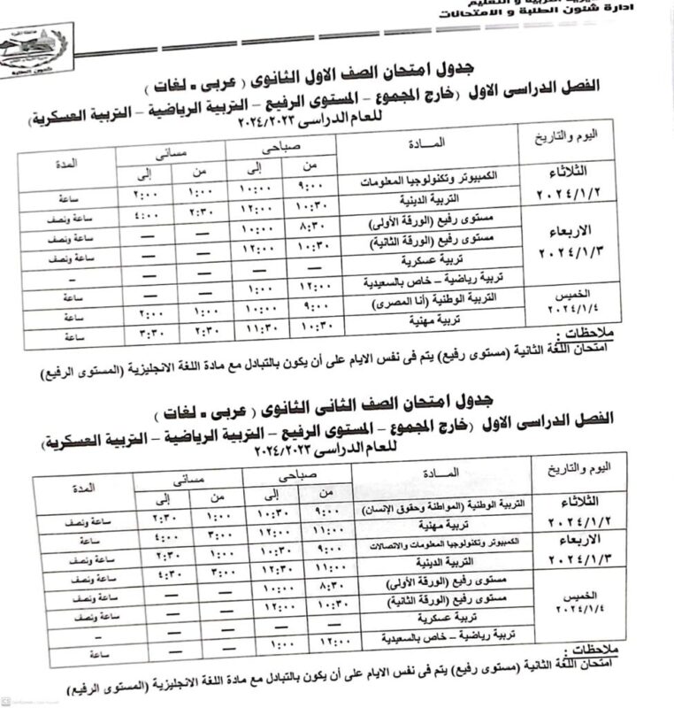 - تبدأ امتحانات الصف الثاني الثانوي العام في الفترة من 10 إلي 25 يناير 2024