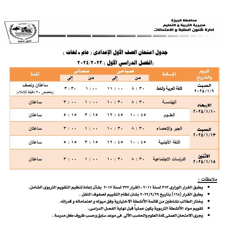 موعد امتحانات الفصل الدراسي الأول 2024 الجيزة الشهادة الإعدادية