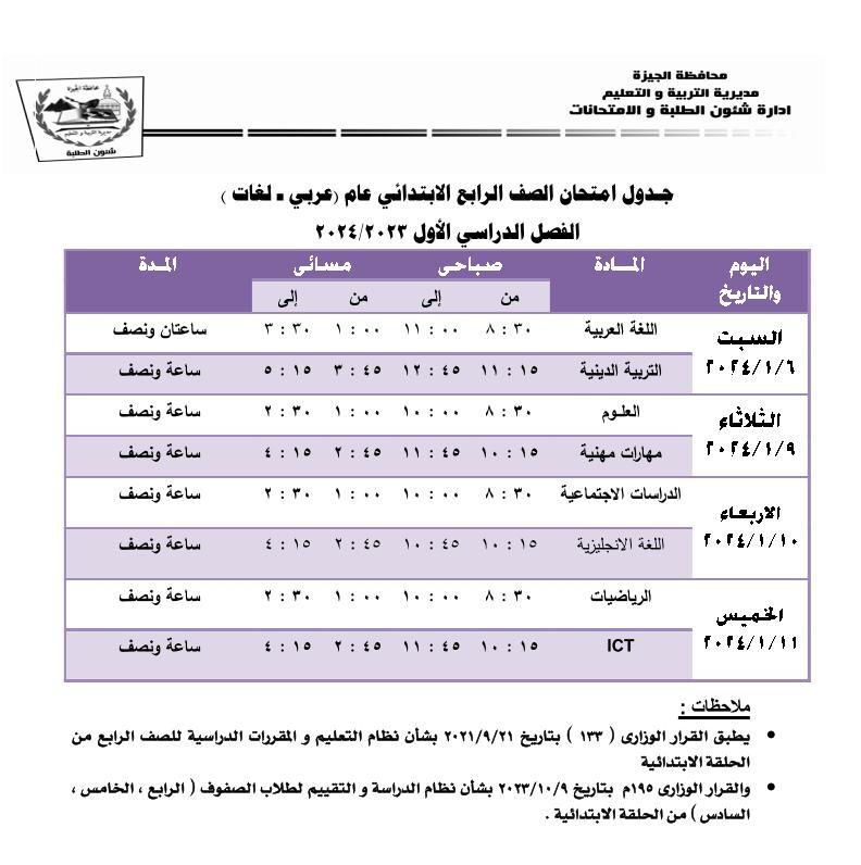 - تبدأ امتحانات الصف الرابع الإبتدائي في الفترة من 9 إلي 16 يناير 2024