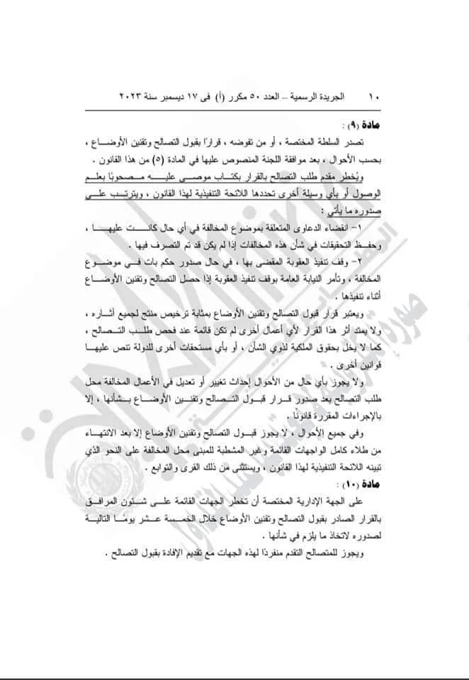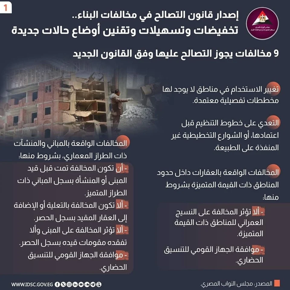 كما تسمح بالتصالح في المخالفات بالمباني والمنشآت ذات الطراز المعماري المتميز، بالإضافة إلى التصالح في المخالفات في العقارات داخل المناطق ذات القيمة المتميزة بشروط معينة، والبناء خارج الأحوزة العمرانية المعتمدة وفق ضوابط محددة.