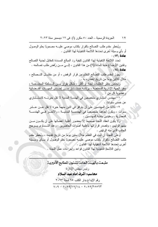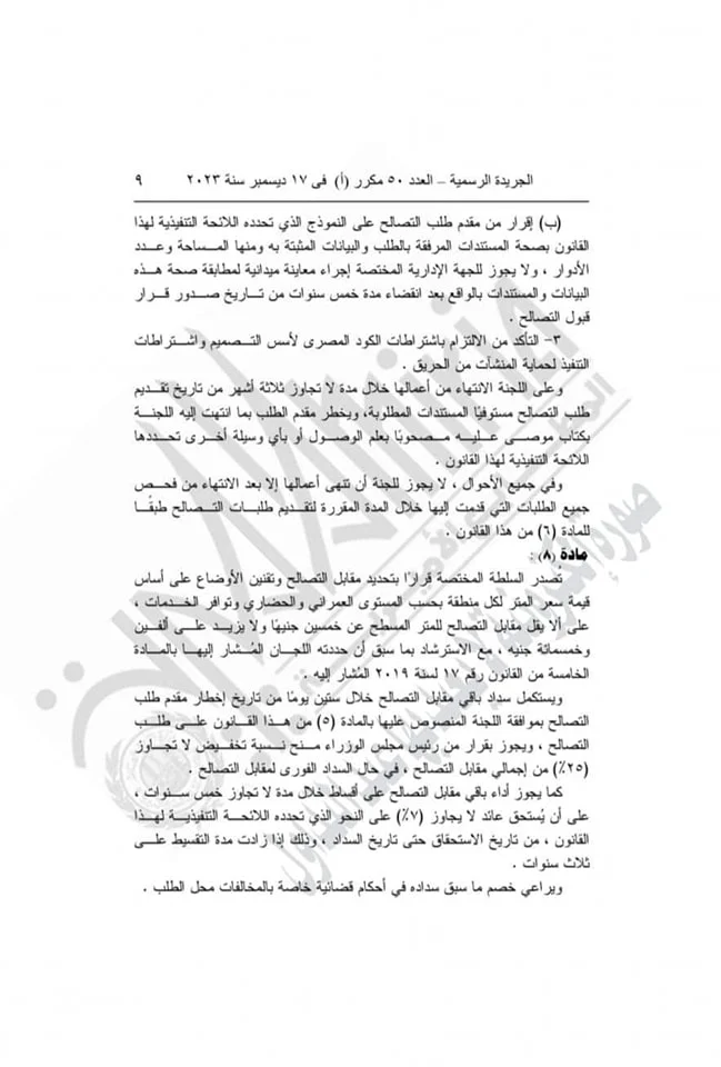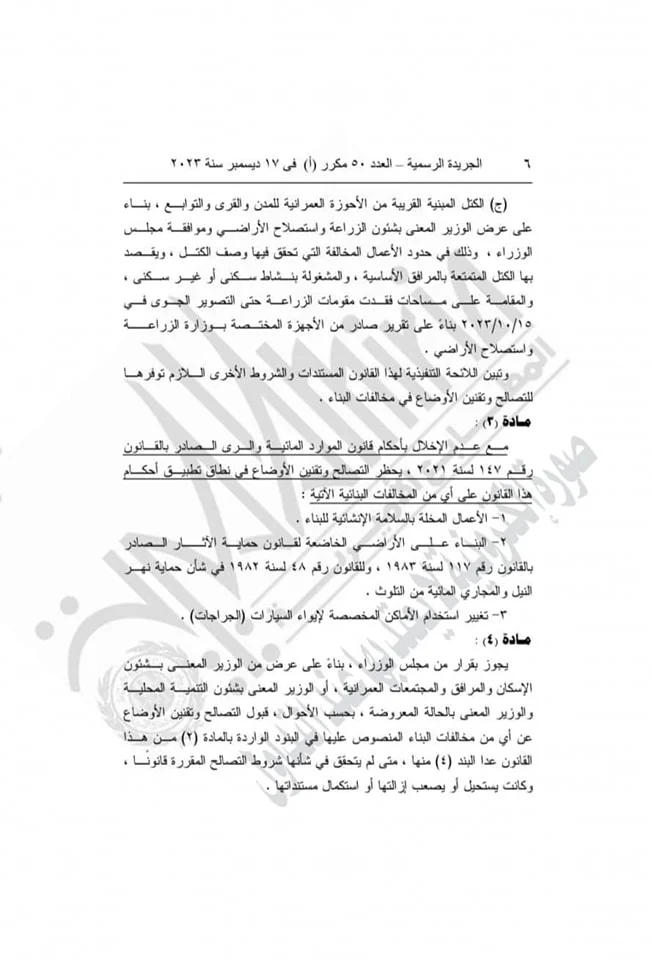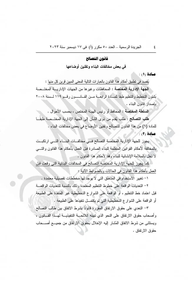 واليكم بالصور نص القانون التي تم اعتدمه من الرئيس السيسي في حالات التصالح في مخالفات البناء في القانون الجديد:ـ