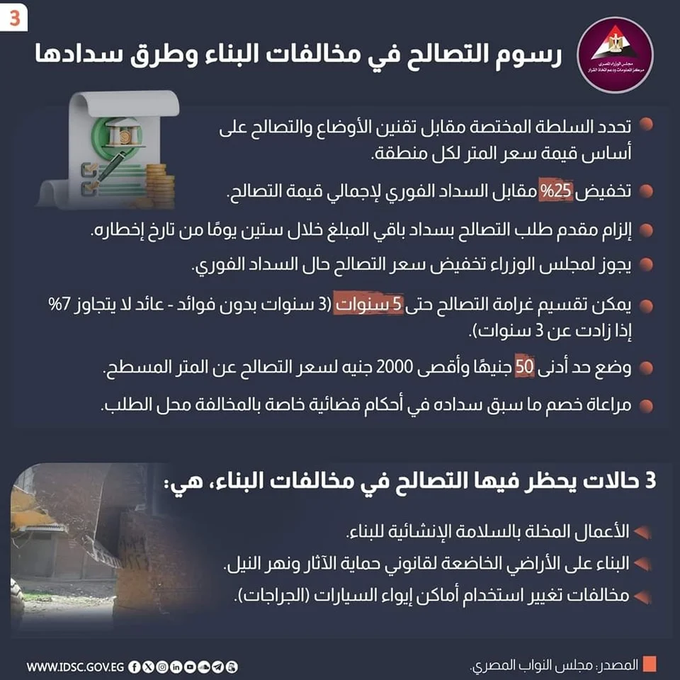 وقد عملت الحكومة المصرية ومجلس النواب خلال الفترة السابقة على تحديد نصوص وآليات تنفيذ القانون بصورة دقيقة لضمان سداد المخلفات وتقنين أوضاعها.