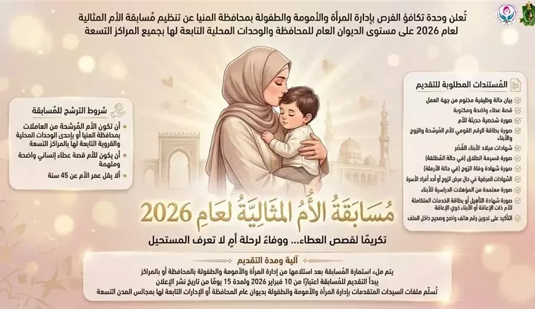 أعلنت وحدة تكافؤ الفرص بإدارة المرأة والطفولة والأمومة بديوان عام محافظة المنيا عن فتح باب التقدم لمسابقة «الأم المثالية» لعام 2026، وذلك تقديرًا لعطاء المرأة وتضحياتها، وتكريمًا للموظفات والعاملات بديوان عام المحافظة والوحدات المحلية للمراكز التسعة.